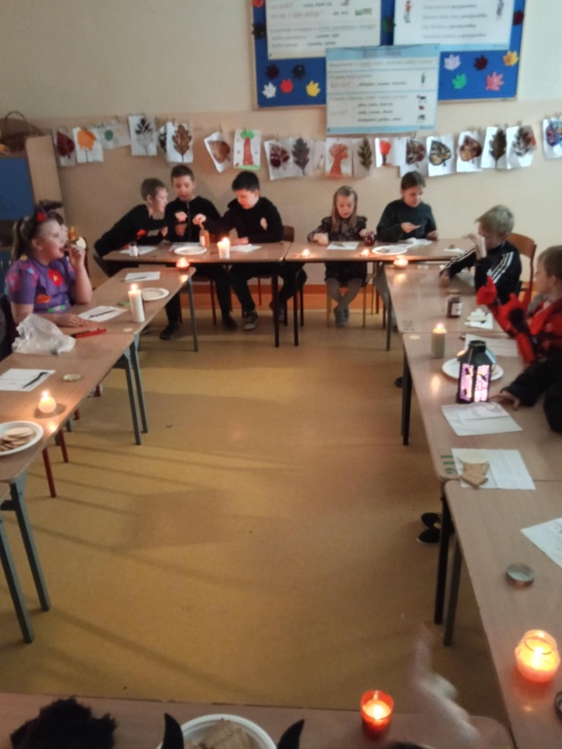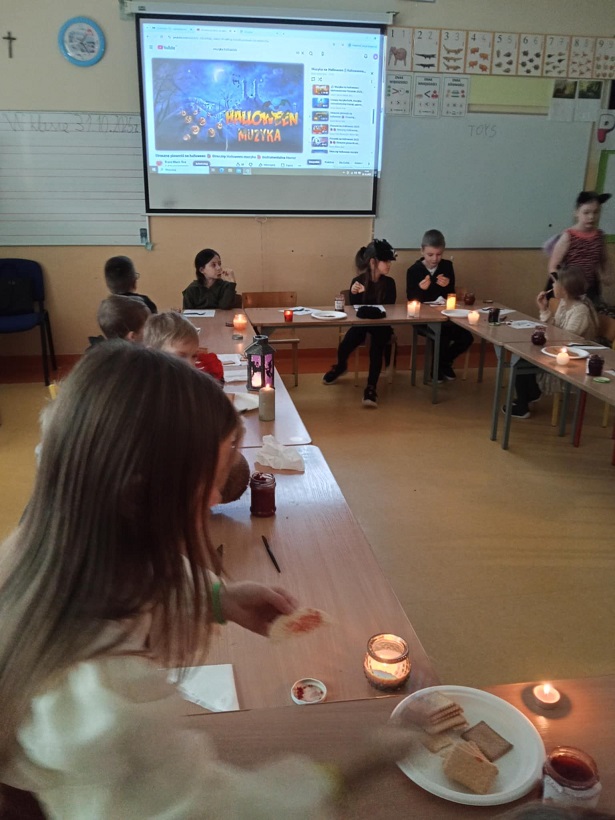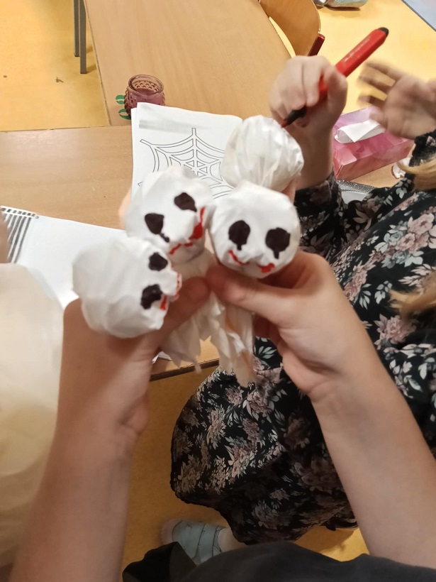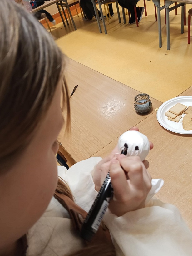 Dnia 31 października w klasie 2e zapanował wyjątkowy i magiczny nastrój! Przy blasku świec dzieci tworzyli duszki, pająki i inne halloweenowe ozdoby. Była świetna zabawa, dużo śmiechu i odrobina dreszczyku emocji – wszystko w odpowiednim, tajemniczym klimacie!